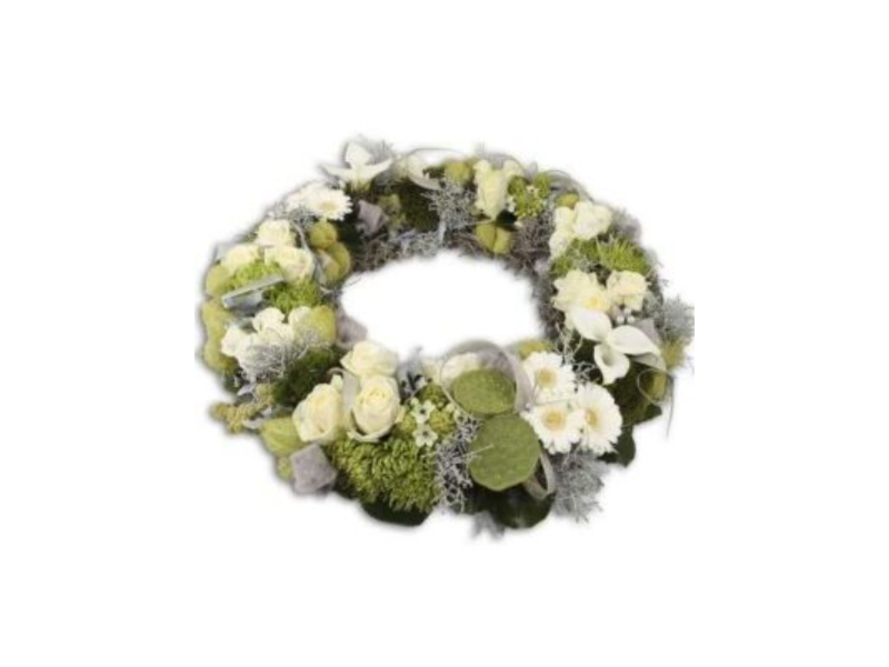 Een stijlvolle rouwkrans met witte bloemen en groen. Symbool voor eeuwige verbondenheid, liefde en herinnering. Duurzaam samengesteld