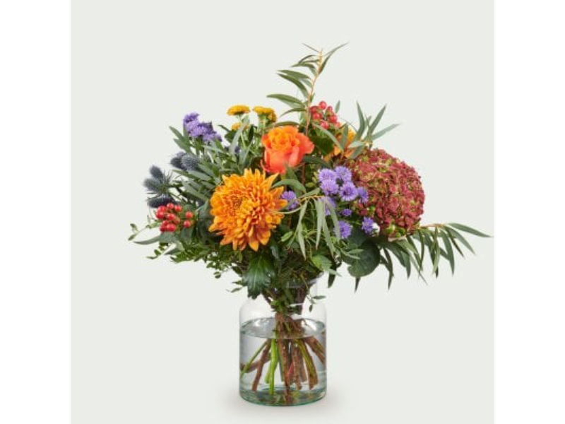 Boeket Lova is een elegant en sfeervol boeket dat de warmte van het seizoen weerspiegelt. Met bloemen in diepe oranje en paarse tinten brengt dit arrangement een gevoel van rust, luxe en gezelligheid. De prachtige combinatie van dahlia’s, hortensia, rozen en seizoensgroen maakt elk boeket uniek.