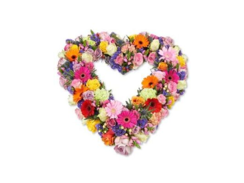 Een kleurrijk open rouwhart, gevuld met rozen en gerbera’s. Symbool van liefde, verbondenheid en een warm eerbetoon.