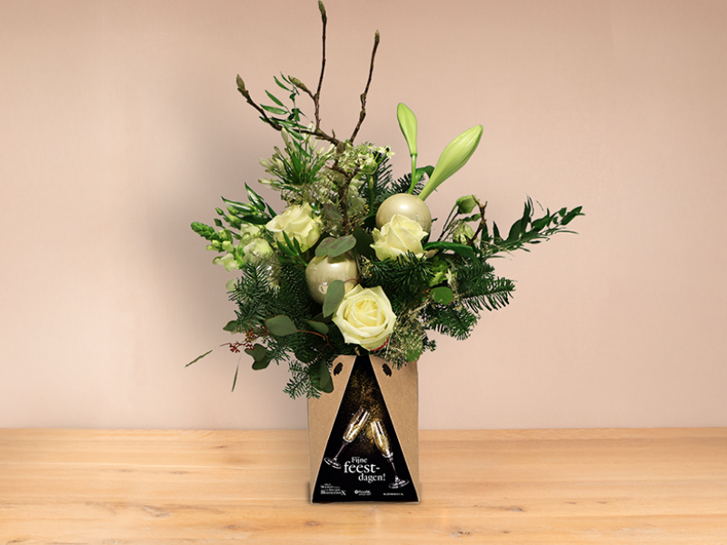 Feestelijk boeket met witte bloemen en weeldig kerstgroen. BloemenboxX geleverd met themakaart "Fijne feestdagen".