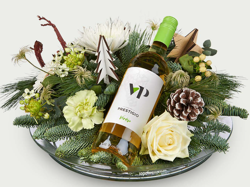 Een elegant wit kerststuk met premium witte bloemen, groen en een fles witte wijn. Perfect als geschenk of decoratie