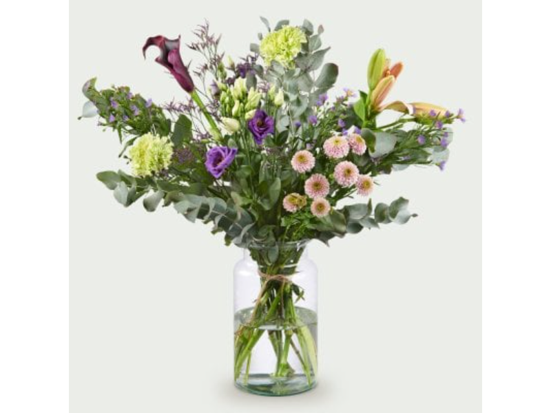 Een stijlvol en luchtig handgebonden boeket met lisianthus, lelie en seizoensbloemen. Perfect cadeau of sfeermaker in huis.