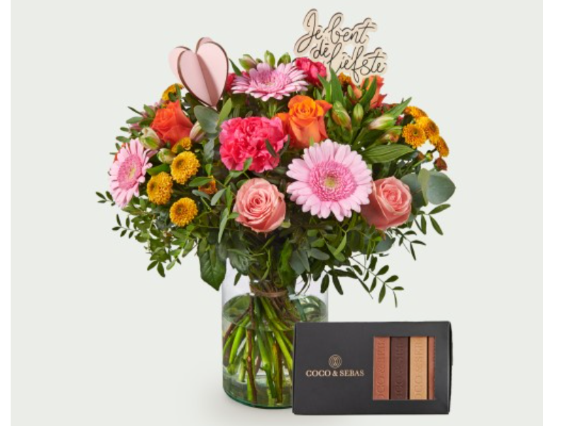 Liefdesboeket Alley is met zorg samengesteld uit een rijke combinatie van bloemen in roze, oranje en gele tinten, waaronder rozen, gerbera’s en fijne seizoensbloemen, aangevuld met fris groen. Het boeket heeft een levendige en positieve uitstraling en wordt verrijkt met liefdevolle details die het g