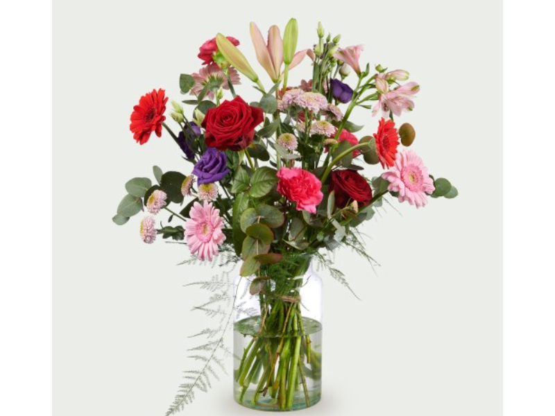 Boeket Carmen is met zorg samengesteld uit een rijke variatie aan bloemen, waaronder rozen, gerbera’s, lelies en verfijnde seizoensbloemen. De combinatie van rood, roze en zachte accenten, samen met fris groen, zorgt voor een dynamisch en stijlvol geheel. Dit boeket straalt energie, warmte en elegan