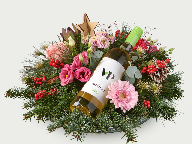 Een feestelijk roze kerststuk met elegante bloemen, dennen en decoratie. Inclusief witte wijn voor een compleet cadeau.