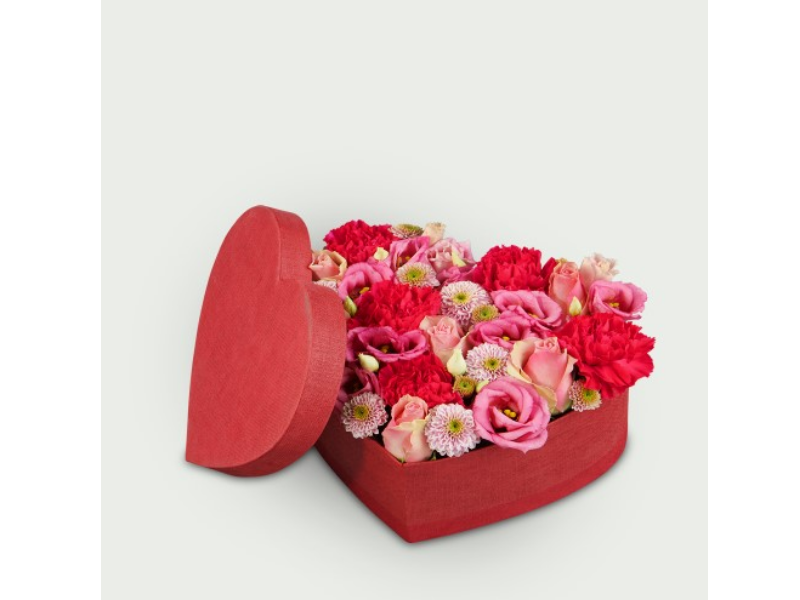 Een luxe hartvormige bloemenbox in warme roze- en roodtinten. Met o.a. rozen, lisianthus, anjers en fijne seizoensbloemen. Liefdevol handgemaakt door