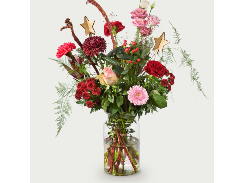 Boeket Joy is een feestelijk samengesteld boeket met prachtige rode rozen, roze gerbera’s, lisianthus, dieprode chrysanten en speelse decoraties zoals houten sterren. Afgewerkt met luxe groen en winterse accenten heeft dit boeket een warme en uitnodigende uitstraling. Ideaal voor kerst, een verjaard