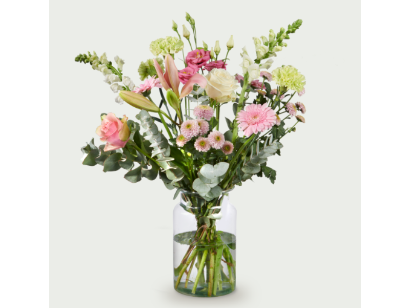 Boeket Mia is een stijlvol roze boeket met frisse bloemen. Een handgebonden verrassing voor elk moment van het jaar.