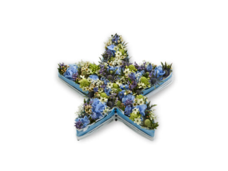 Een uniek rouwbloemstuk in de vorm van een ster, met blauwe en witte bloemen. Symbool van licht, troost en eeuwige herinnering.