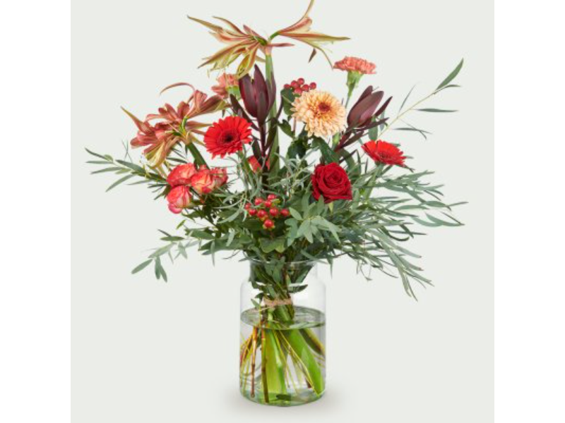 Boeket Romeé straalt elegantie en warmte uit met zijn diepe rode en oranje tinten. Een stijlvol boeket dat liefde en klasse uitdrukt.