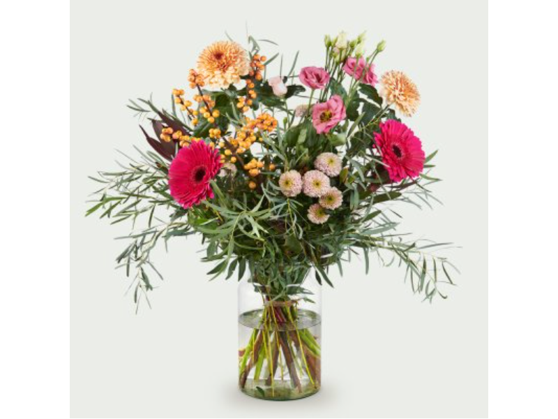De combinatie van chrysanten, germini’s en lisianthus in roze en oranje tinten zorgt voor een levendig geheel.