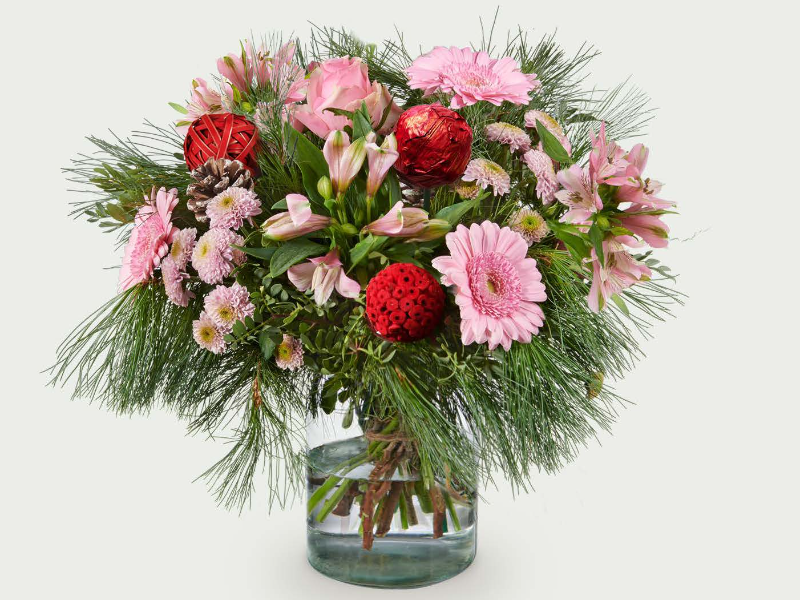 Warm winters boeket met roze bloemen, dennegroen en rode accenten.