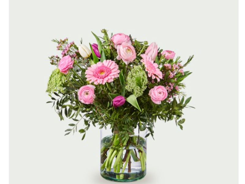 Boeket Maira is een elegant en verfijnd samengesteld boeket met een harmonieuze mix van bloemen in zachte roze tinten, aangevuld met fris groen. De combinatie van verschillende bloemvormen zorgt voor een speels maar rustig geheel. Dit boeket wordt met de hand gebonden door onze bloemisten en samenge