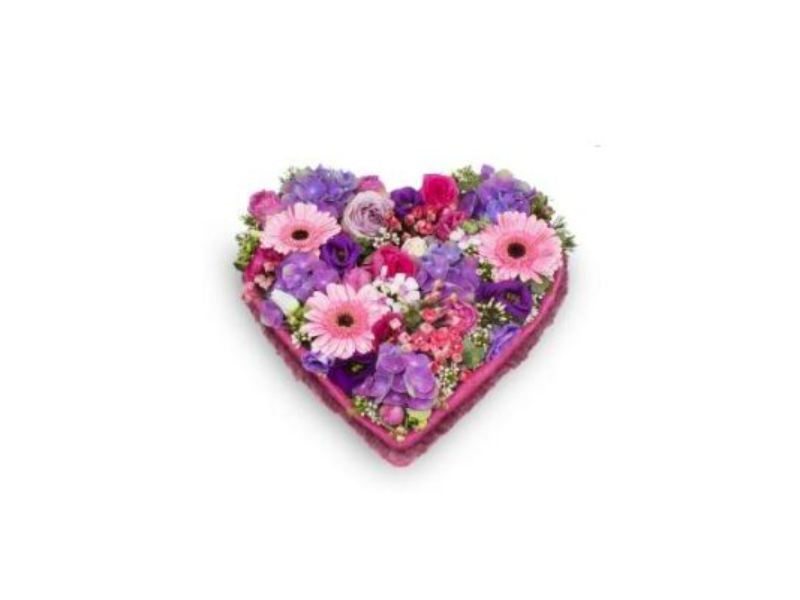 Een gesloten rouwhart met roze en paarse bloemen. Symbool van liefde, troost en een warm eerbetoon bij afscheid.