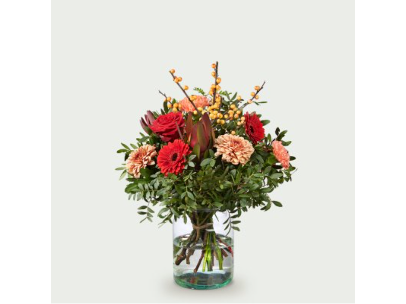 De warme tinten van rode rozen, zalmkleurige chrysanten en oranje germini’s zorgen voor een luxueuze en volle uitstraling.