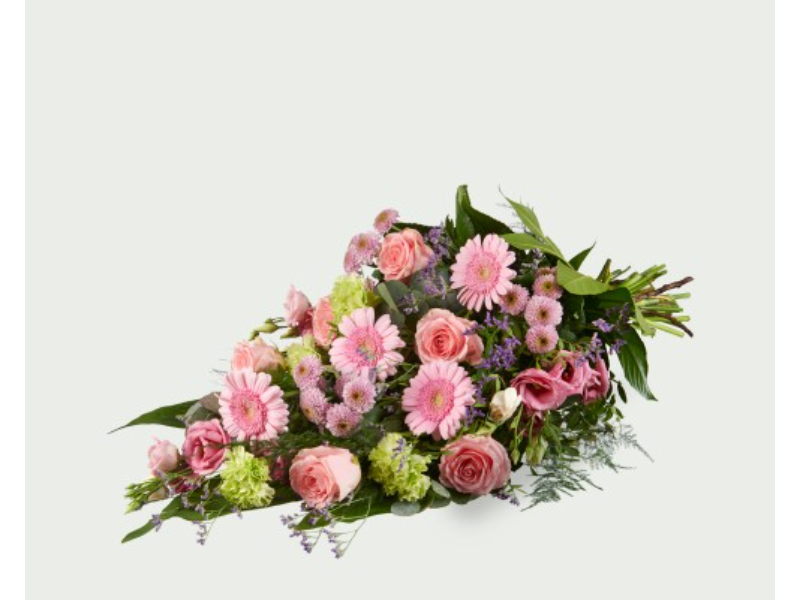 Rouwboeket Intens Roze straalt zachtheid en liefde uit. De La Belle rozen vormen het hart van dit bloemwerk, aangevuld met germini’s, lisianthus en chrysanten in zachte roze tinten. Limonium geeft een subtiele blauwe nuance die het geheel extra diepte en karakter verleent. Het bladwerk van aralia, a