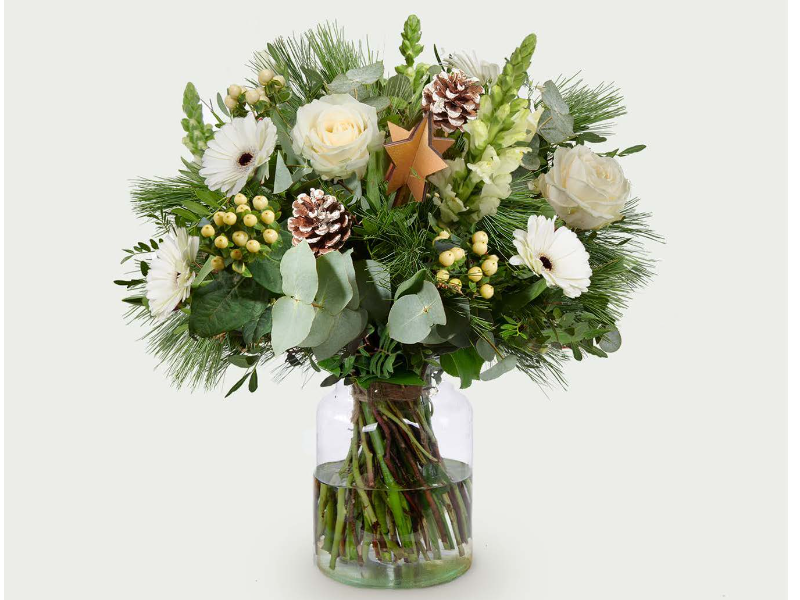 Boeket Lois is een luxe en handgebonden kerstboeket met witte rozen, gerbera’s, lisianthus, eucalyptus, besmaterialen en dennengroen. Dankzij het duurzame assortiment en de stijlvolle winterdetails is dit boeket geschikt voor iedere gelegenheid in de feestmaand. Ideaal om cadeau te geven of in huis