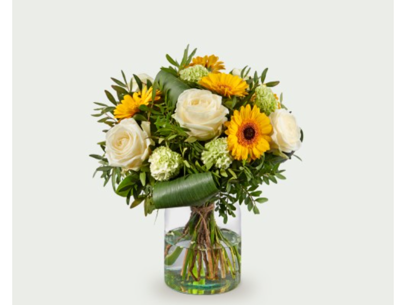 Boeket Evalie is een compact en stijlvol boeket met een mooie balans tussen zachte witte tinten en warme gele bloemen. De combinatie van frisse groentinten en speelse vormen zorgt voor een natuurlijke en elegante uitstraling.