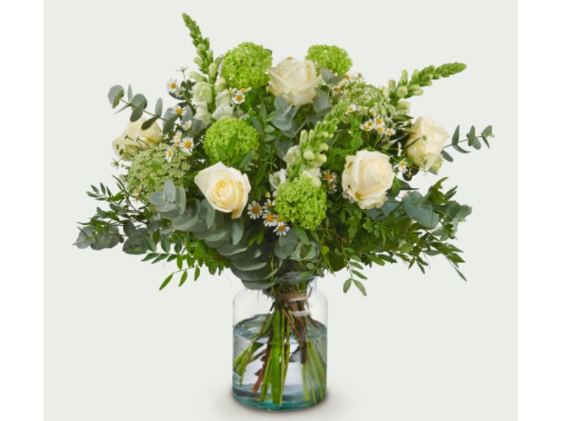 Een fris en stijlvol boeket in wit en groen. Perfect voor een rustige en elegante sfeer in huis.