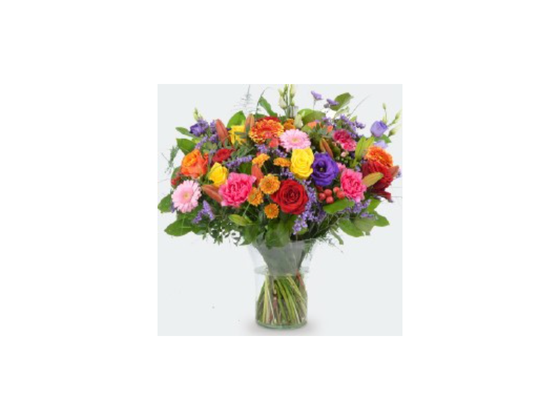 Een rijk en kleurrijk boeket met een speelse en luxe uitstraling. Perfect om indruk te maken of iemand feestelijk te verrassen.