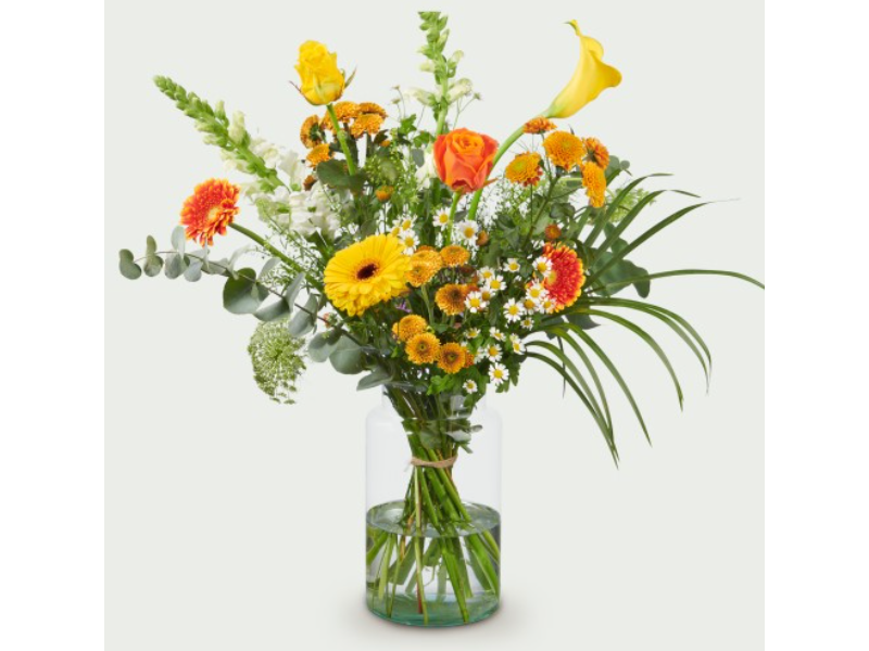 Een zonnig en vrolijk boeket met warme gele en oranje tinten. Perfect om een ruimte op te fleuren of iemand blij te maken.