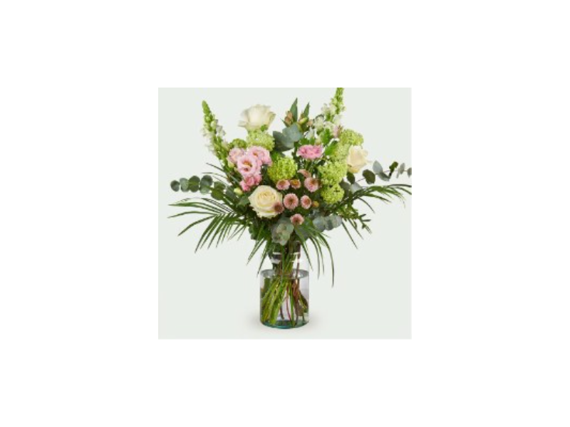 Boeket Lola is een verfijnd en luchtig boeket met zachte kleuren zoals wit, lichtroze en frisgroen. De combinatie van bloemen en speels groen geeft het boeket een natuurlijke en elegante uitstraling.