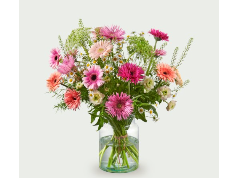 Boeket Monica is een luchtig en speels boeket met verschillende roze en perzik tinten, gecombineerd met fris groen en fijne bloemetjes. De zachte kleuren en natuurlijke vormen zorgen voor een frisse en romantische uitstraling.
