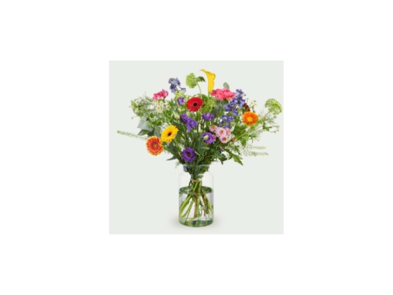 Boeket Rheza is een luchtig en natuurlijk boeket met een speelse combinatie van kleurrijke bloemen en fris groen. De variatie in vormen en tinten zorgt voor een levendig en eigentijds geheel dat in elke ruimte tot zijn recht komt.