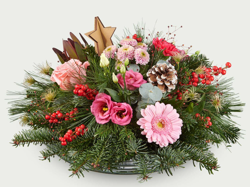 Een romantisch roze kerststuk met fijne bloemen en seizoensgroen. Ideaal voor een warme en sfeervolle kersttafel.