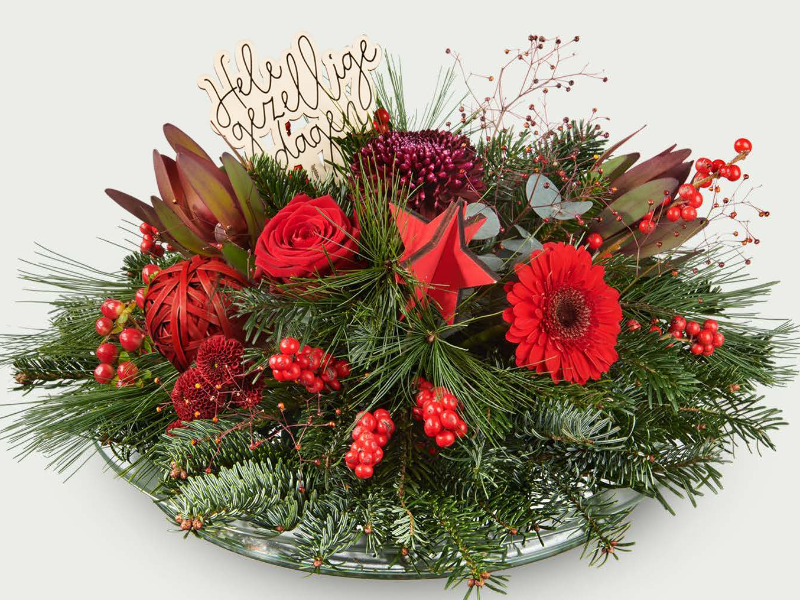 Een stijlvol kerststuk met rode bloemen, dennengroen, bessen en decoraties. Perfect voor een warme en gezellige sfeer tijdens de feestdagen.