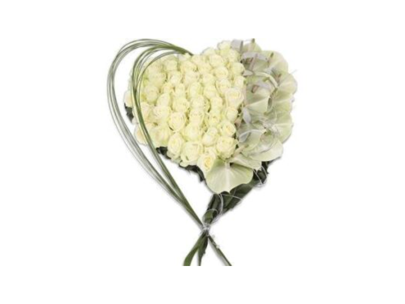 Een stijlvol rouwstuk in hartvorm met witte rozen en anthuriums. Symbool van liefde, rust en een waardig afscheid.