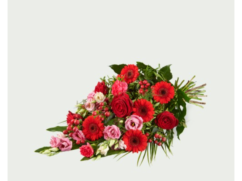 Rouwboeket Intens Rood is een stijlvol en krachtig bloemwerk dat symbool staat voor liefde en respect. De diepe rode Red Naomi rozen vormen samen met de donkerrode germini’s het hart van dit boeket. Roze lisianthus en cerise dianthus brengen een vleugje zachtheid, terwijl hypericum zorgt voor verfij