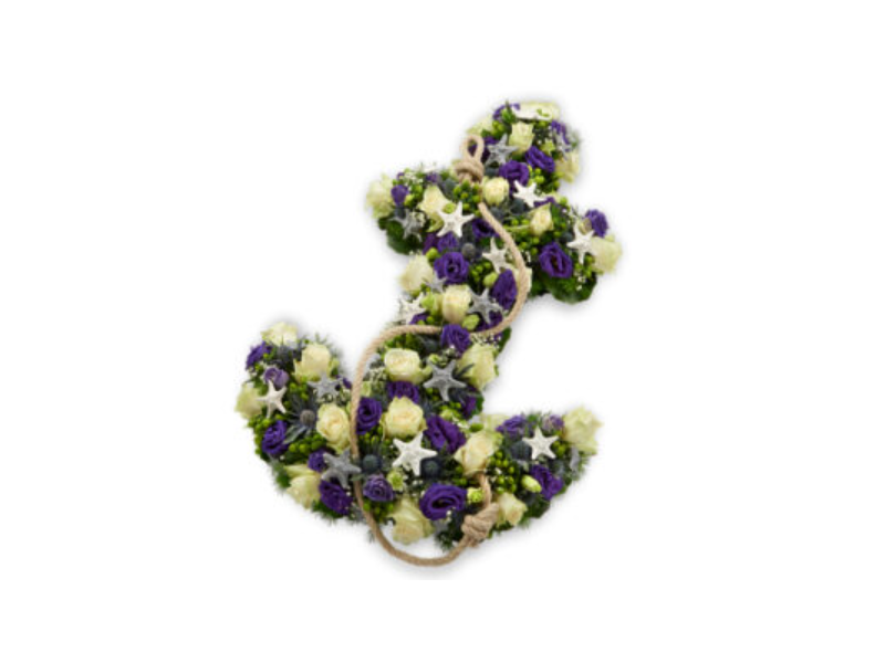 Rouwbloemstuk Anchor is een indrukwekkend bloemwerk in de vorm van een anker, zorgvuldig opgemaakt met witte en paarse bloemen. Het anker staat symbool voor houvast, vertrouwen en eeuwige verbondenheid, waardoor dit arrangement een diepe en persoonlijke betekenis heeft. Afgewerkt met decoratieve det