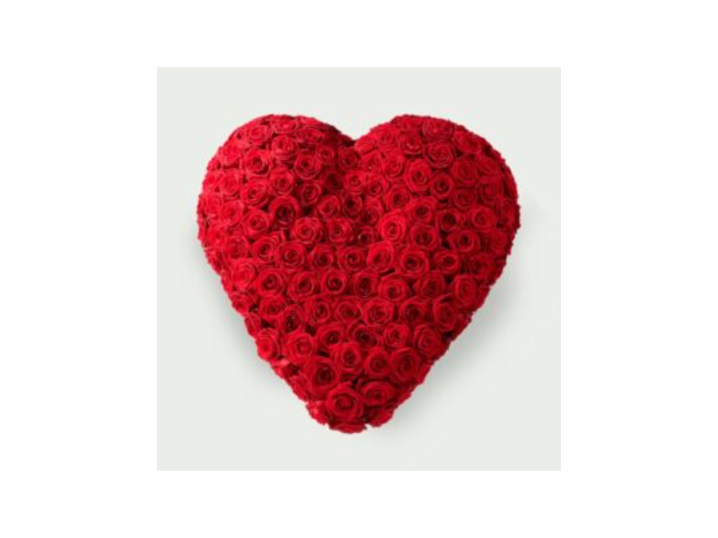 Een indrukwekkend gesloten rouwhart, volledig gevuld met rode rozen. Symbool van liefde, respect en een warme herinnering.