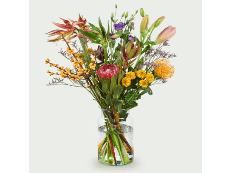 Boeket Janine is een eigentijds, handgebonden boeket met exotische bloemen en warme kleuren – een waar pronkstuk in elk interieur.